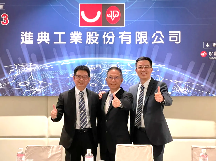 進典工業董事長兼執行長范義鑫(左)、進典工業總經理范義明(中)、財務部副總兼發言人黃彥文(右)。圖/沈美幸